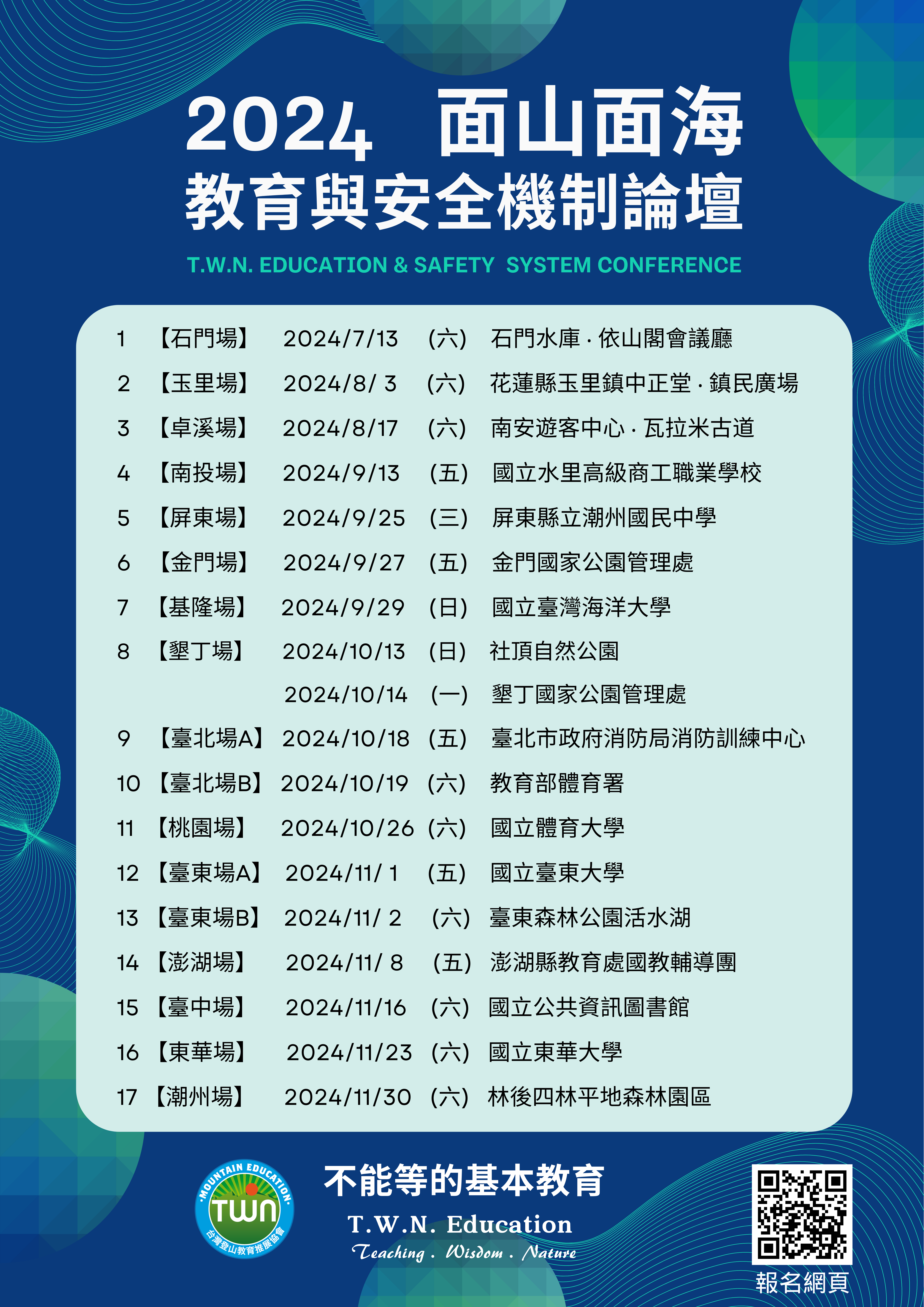 三、檢附旨揭論壇總表1份,各場次議程表及報名詳協會網站: http://twnmouedu.wix.com/-twnmountain,若有相關問題,請寄信至協會電子信箱:twnmouedu@gmail.com。